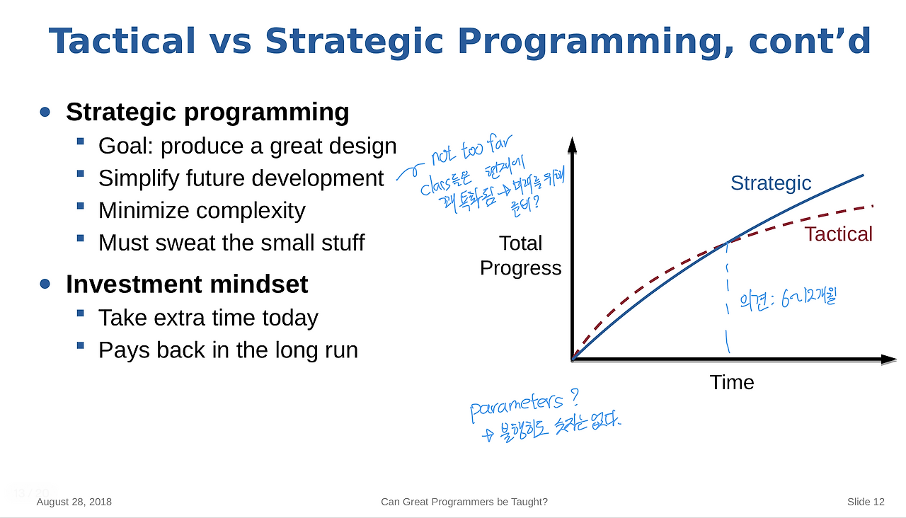영웅적인 큰 투자가 아니라 조금씩의 꾸준한 투자. 모든 시스템을 완전히 디자인하기위해 6개월을 투자할 수는 없다. 조금씩 점진적으로 투자해야한다. 그래서 모듈을 새로 만든다면 인터페이스를 설계할 때 조금의 시간을 투자하고 deep classes와 함께하도록 시도해라. 어떻게 진행되는지 문서로 작성하고 , 단위테스트도 물론이다.