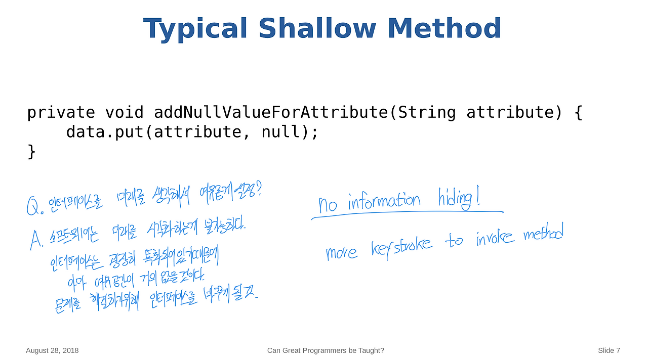 전형적으로 보이는 얕은 클래스의 예시이다. 정보 은닉이 없다. 게다가 함수를 호출하는데 실제로 실행되는 함수보다 타자를 더 많이쳐야한다.
